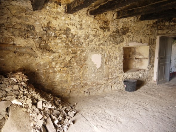 RETOUR sur le causse , pour tout le monde cette fois : pour les vaillants , et les moins vaillants ; tout le monde ou presque aura gouté du piqueur ; sensation bien connue pour certains … 5 kgs le matin et 50 kgs le soir dans les bras !!!! après une bonne journée et demi le résultat est là ;;; incroyable ! la future cuisine est quasiment toute décroutée et les gravats en partie évacués : génial
