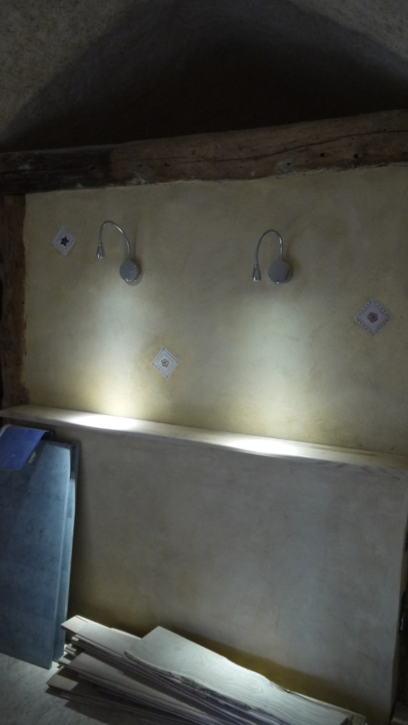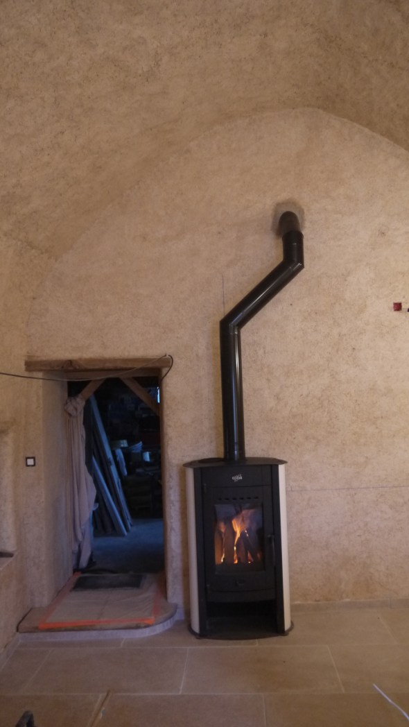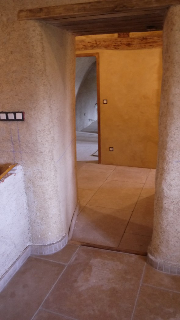 Cela fait bientôt 1 mois d’aller retour vers le Causse : enfin quelques nouvelles du chantiers pour les « suiveurs » du blog (c’est mieux que followers !)… ma période purgatoire est terminée , deux weekends à genoux à s’affairer au carrelage et ses joints; plus de la pose de luminaires,du poêle dans la cuisine (qui chauffe!!)des joints de la salle de bains, d’une tablette en châtaigner en guise de chevet , et pour finir : enduit à la chaux sur les murets de l’ilot central et de la « banque » de la future cuisine …