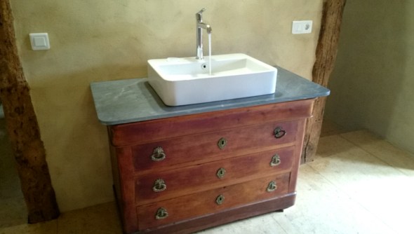salut à tous et toutes ! bientôt vous retrouverez de vraies images de chantier : marteau piqueur et compagnie mais en attendant il faut se faire à l’idée des finitions importantes :meubles lavabo et déménagement en cours ….coup de lasure sur les portes qui ont morflées le temps du chantier ! c’est pas rien de regarder sous la bâche du déménagement d’il y a 5 ans …