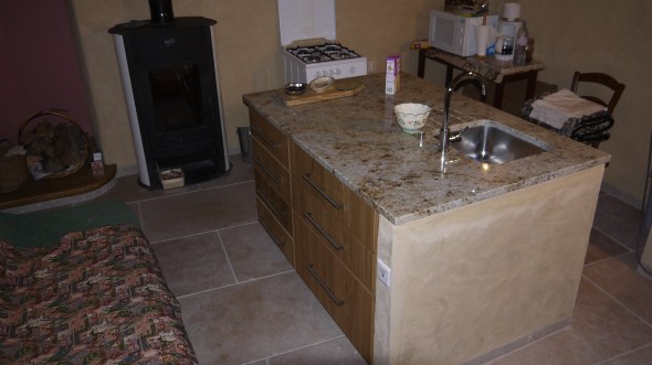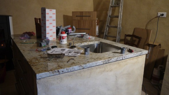 Voilà , on y habite ! la « vieille » a été investie: on avait dit 5 ans et bien on y est avec 6 mois d’avance … plan de l’ilot en granit livré et posé : merci à SAM pour le coup de main , juste un petit truc de 160 à 180 kilos ….la plomberie sous l’évier n’a été qu’une formalité … bref plus rien à faire !!!que nenni ! allez va voir dehors ! enfin à l’atelier , il y a quelques CAILLOUX à débarrasser … et puis ensuite on commencera le « hérisson » de la salle de bains de ce qui sera une chambre spacieuse , environ 34m² …la votre de chambre , les amis !!!que c’est bon l’apéro chez soi , la cuisine chez soi …ADIOS MOBILHOME !