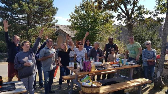 Super weekend ! beau temps : l’été semble s’éterniser sur le Causse (ça ne va pas durer) la jardinière est quasi finie , ses murs sont remontés il ne manque plus que la « coiffe » des murs en lauzes plates ; elle aurait du être finie dans le weekend ,la faute à un apéro surprise , organisé au four à pain , pour et par les habitants du hameau …il s’agissait de déterminer le nom des rues et chemins du hameau par une votation citoyenne ….. MDR : l’apéro ainsi que la votation (on a du refaire le vote et le décompte au moins 3 fois) se sont éternisés jusque vers 16 h …. heureusement le mur était monté avant !!! le lendemain ,un peu de ménage devant la bâtisse …quelques caillasses à débarrasser et puis s’en va ! Pour mémoire : nous sommes maintenant « montée du four » …