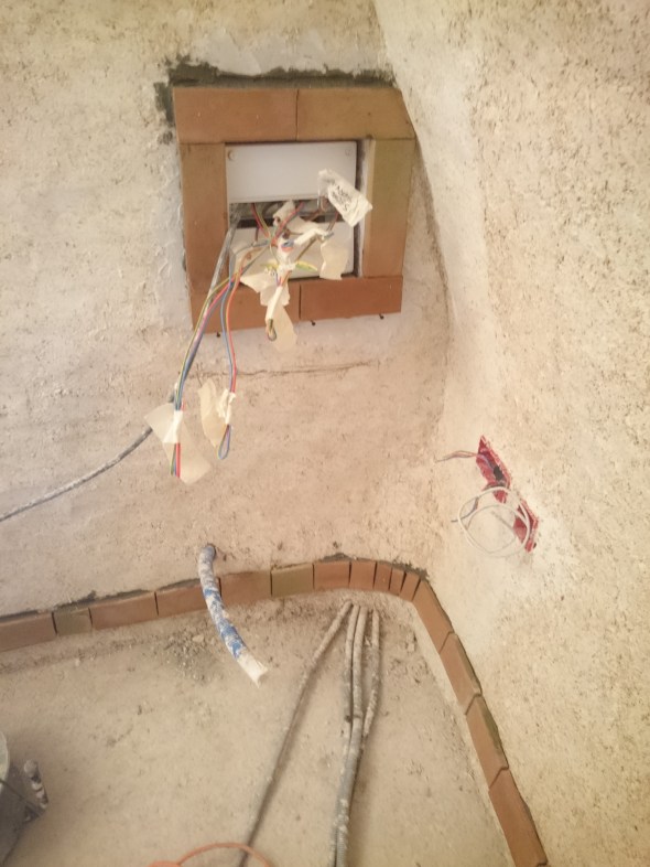 Et oui je sais ça ne ce fait pas comme ça …. on ne met jamais de plinthes avant d’avoir réaliser le sol !!! eh ben si parce que moi je veux le faire comme ça …astuce : mes enduits vont venir mourir sur le bord de plinthe en terre cuite …je me vois mal faire le parquet puis les plinthes et enfin les enduits ;;; donc, donc, donc je commence à l’envers on verra bien à la fin ! plinthes au laser …belle invention ce laser ! et puis un peu du fignolage sur la fenêtre , et sur la marche que j’avais coulée trop haute (sans le laser!) ..eh merde !