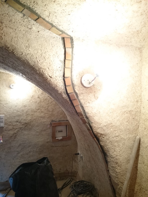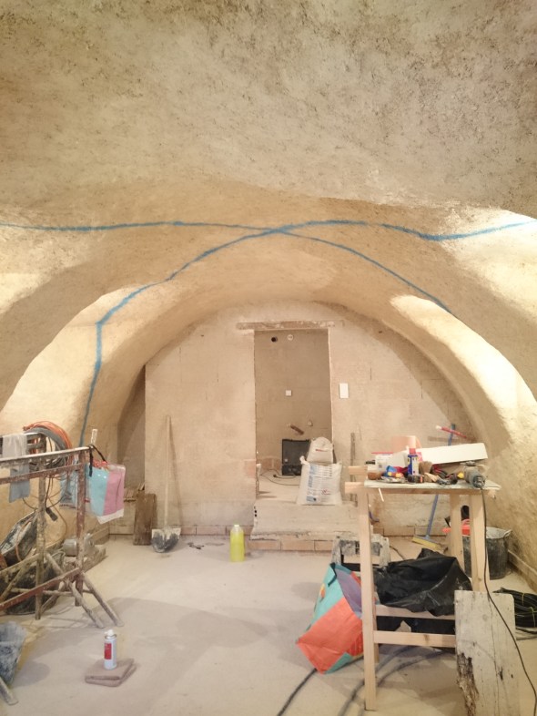 bonnnnnnne année 2019 ….santé,prospérité à tous ! deux longs mois , et ouais 2 mois sans rien faire , la faute aux fêtes, à une voiture récalcitrante, et surtout JILL ET JOHN … Enfin bref de retour aux affaires , du coup en janvier ça pèle là haut , alors le bon ROBERT me prête son joli poêle de chantier …et on commence par « casser »(couper) des terres cuites pour en faire des tesselles …pourquoi faire ahahaha !!! laser sur les voutes + bombe de peinture, on trace , puis petite saignée sur ces belles lignes et enfin on se met à coller ces tesselles … un joli malon de couvert au plafond, faut être fondu! je persiste , ça me servira de séparation pour mes enduits à la terre ,mais ça c’est pour plus tard …un fois le printemps venu !!! une galette plus tard en compagnie du quartier et nous voilà sur le départ!! bonne nouvelle… les menuiseries tant attendues arrivent bientôt …..