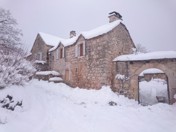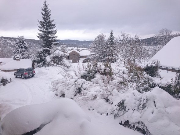 Bon service météo … pluie ou petite neige mêlée …ben voyons !!!! samedi quelle surprise !!et alors en fin de weekend je vous raconte pas … 60 cms ,sur la tronche!du coup ; j’ai passé une bonne partie du temps à déneigé . sinon quand même ,une fois le tas de bois atteint et le poêle approvisionné on a continué à jointer les plinthes et tesselles …je devais descendre au ROZIER pour voir les menuiseries en cours de finalisation : même pas pu ! incroyable weekend FINLANDAIS !