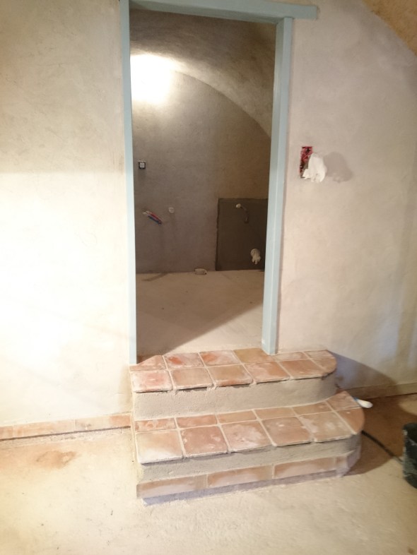 Bon , 2 weekends productifs …. je reviens enfin sur le blog pour quelques nouvelles : on « ferme » la chambre le weekend prochain ,le gentil menuisier monte avec les huisseries à fixer !!! chouette .. ça va pas mal finir la pièce ! sinon depuis mars : les enduits bâtards sont terminés dans la salle de bains et sur sa cloison, le doublage pour la douche aussi,les marches de la salle de bains ainsi que celle sous la fenêtre sont finalisées , avec de jolis vieux mallons de terre cuite qui font des envieux … bref une fois les huisseries en place …il ne reste plus que de la déco…. enduit de finition , carrelage, enduits à la terre dans la chambre, seuil à couler , et plancher !!! bon il en reste un peu c’est vrai …en attendant jetez un œil sur le choix des 2 pigments choisis pour colorer les enduits et le tadelakt de la douche …. envoyer les commentaires ! si quelqu’un peut me dire quel est ce joli oiseau qui à décidé de me réveiller tous les matins en tapant à la vitre, ainsi qu’au moment de l’apéro réclamant sa part … mésange noire ???