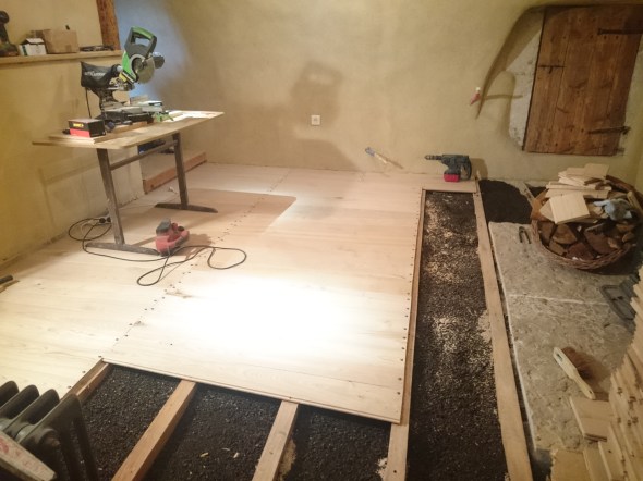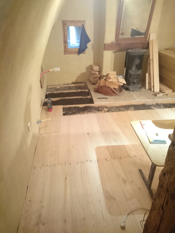 Voilà c’est fait …la chambre est terminée ,et donc comme cela ressemblait à un atelier avant le démarrage de la réhabilitation (un atelier en « bordel » quand même), on a décidé de la nommer « atelier » et pas bordel …. et vient le temps d’emménager de remonter quelques meubles (restés sous une bâche depuis 8 ans!!!) et d’y passer une première nuit ; une nuit sous une voute particulière …il y fait bon ,voir même chaud sans chauffage !! en attente du poêle qui ne devrait pas tarder … aller bon visionnage !!! et du coup j’ai commencé le plancher en queue de billard dans la chambre du haut .