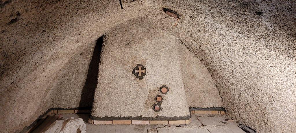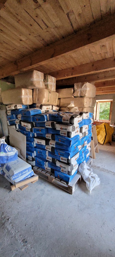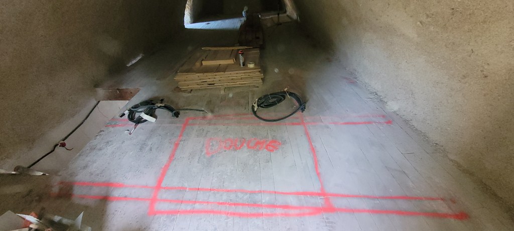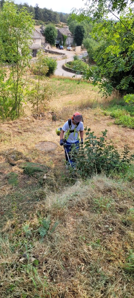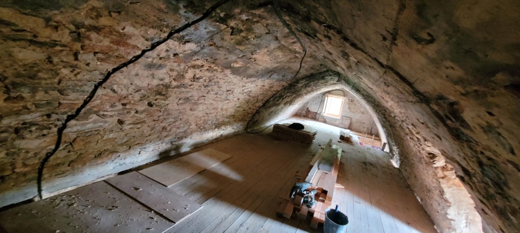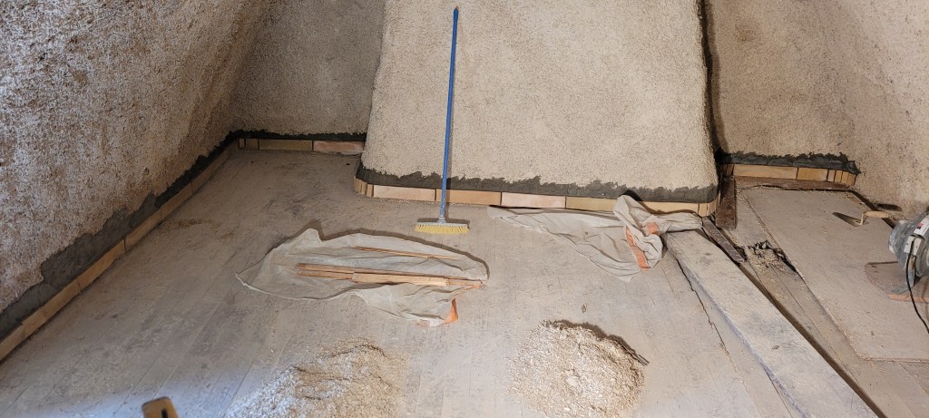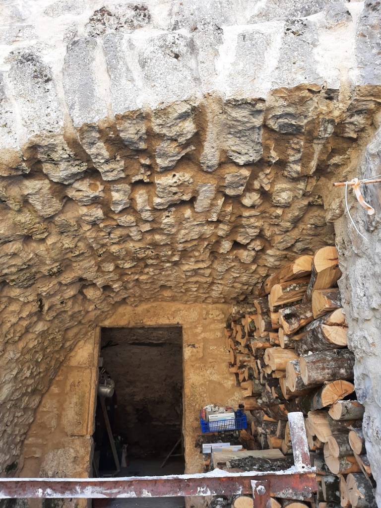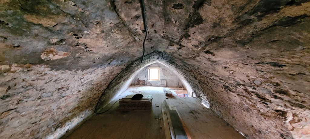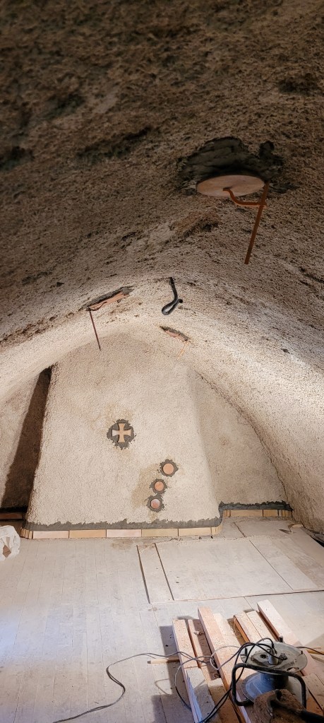 ça y est … 3 semaines intenses et bouillantes , le chantier s’est déporté vers le salon , salle à manger , mezzanine … réception de la commande de chaux et chanvre , chaux chanvre projeté sur la voute , électricité passée (gaines et câbleries etc. …) dans tout le salon ,sur la terrasse et même dans la citerne ….puisqu’il ne tombe plus rien du ciel depuis 4 mois , on en a profité pour vider les citernes et refaire celle de la vieille grâce à l’aide de Jean Philippe … moi je passe pas !!! dans le boyau pour y descendre , rebouchage des fissures , résine ,percement de la citerne pour y faire passer une surverse à 2m70 du fond , enduit au badigeon …et hop , je vais pouvoir enfin récupérer les 17 m3 d’eau qui vont la remplir d’ici l’hiver avec un surpresseur pour alimenter , WC et machine à laver … évidemment il a fallu ranger la livraison de bois , les voutes des entrées des bergeries sont finies (presque) d’êtres rejointées …la pose des terres cuites pour séparer la voute du salon est commencée , les enduits ne devraient plus tardés sur la voute …et ensuite on démontera le plancher … il y a pas mal de boulot avant ça …