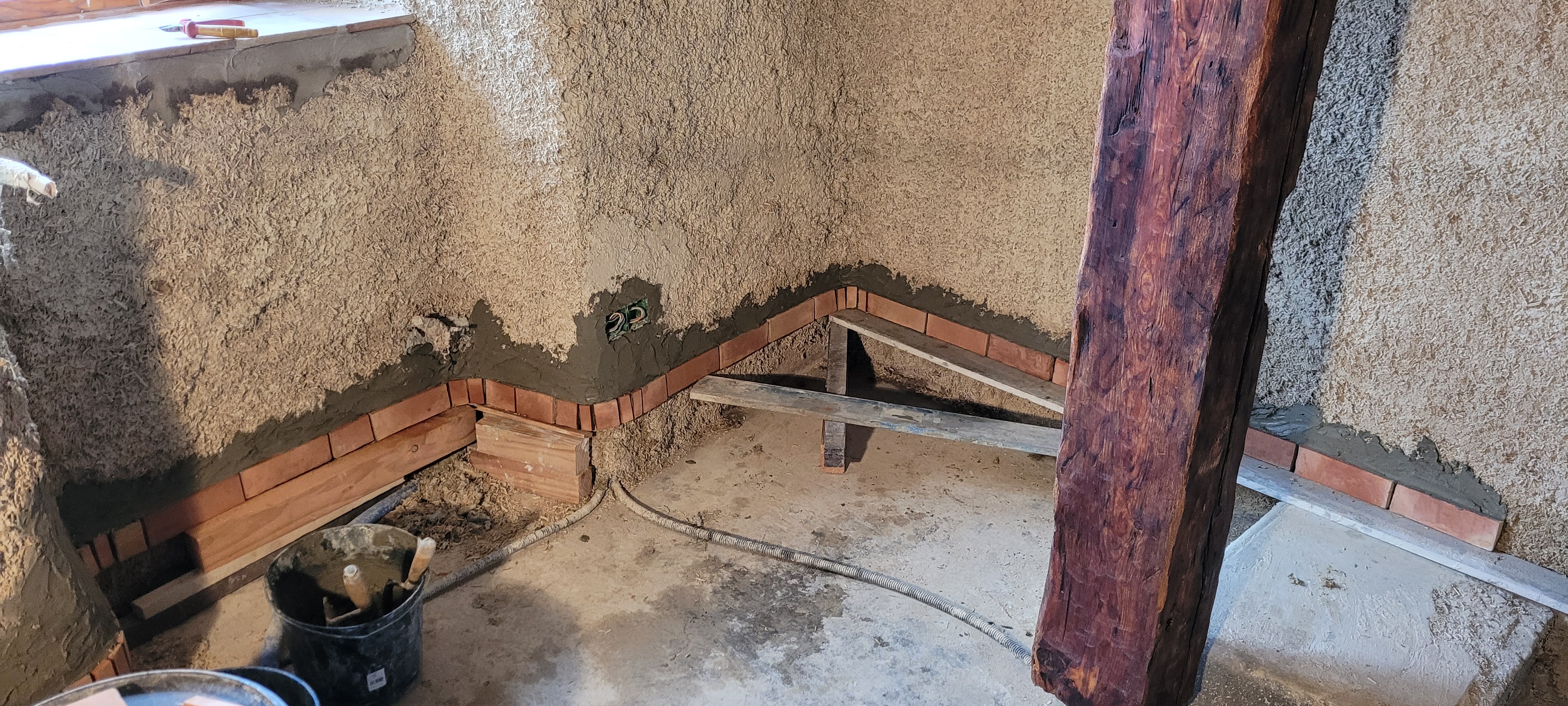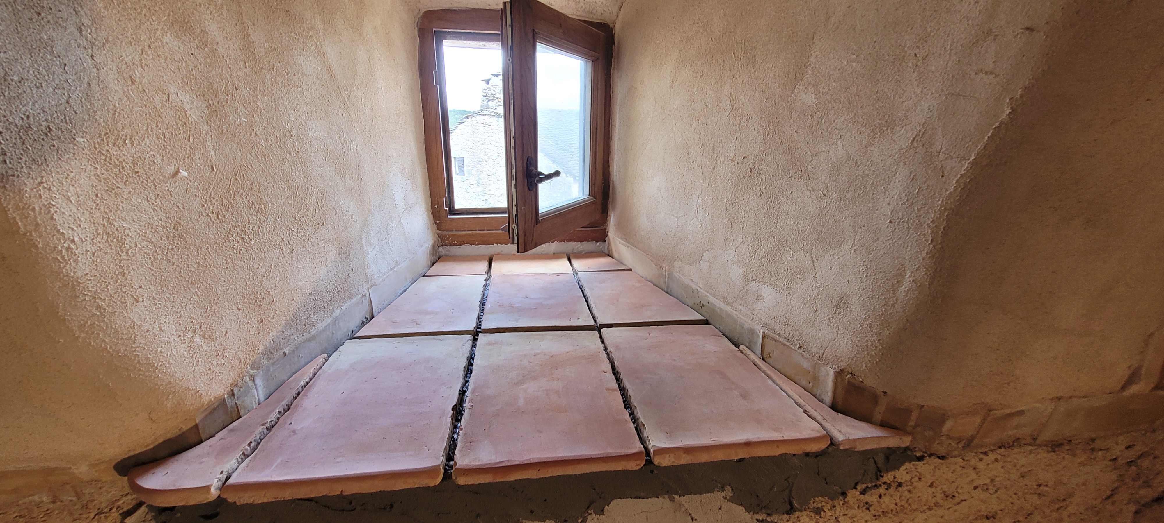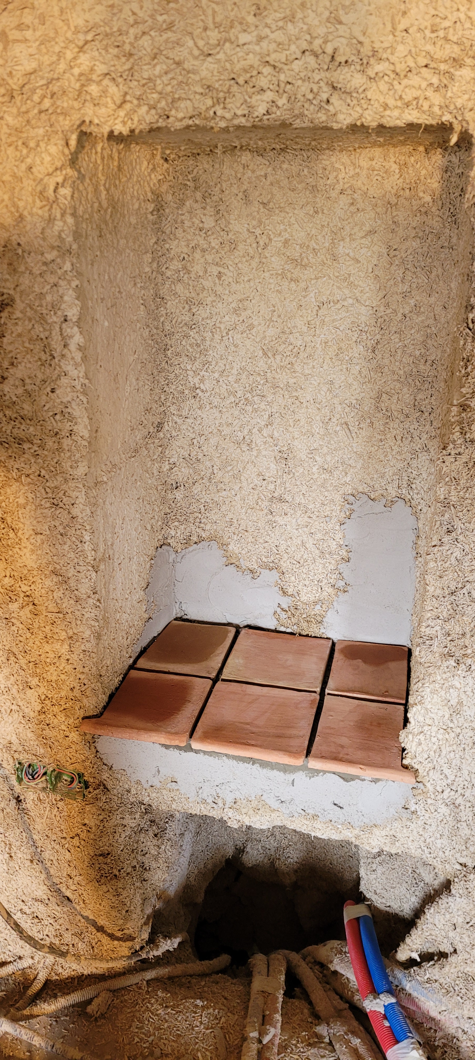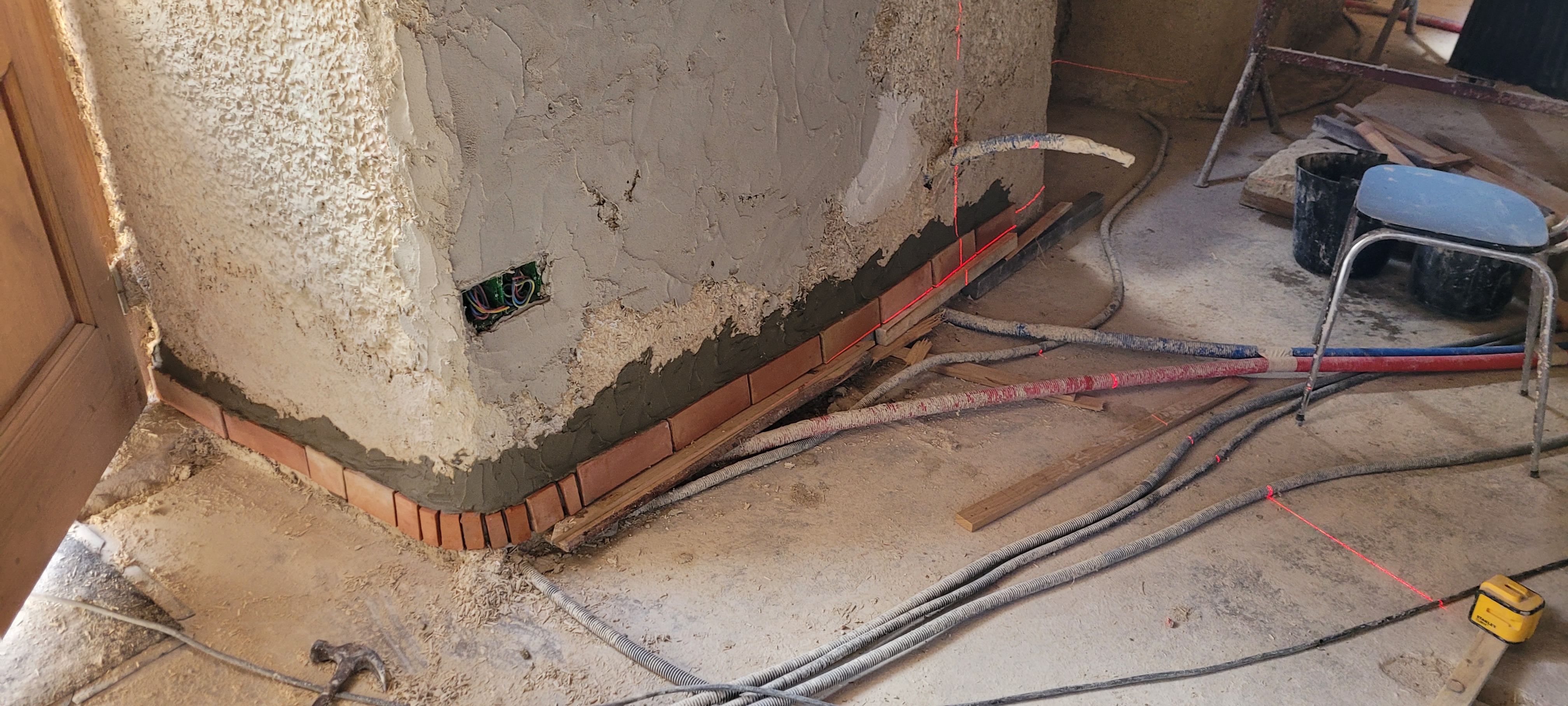 De retour ,mais pas pour du planeur …cette fois , la pluie s’y met , donc on rentre ….du coup je commence les plinthes dans le salon , j’espère finir les enduits dehors d’ici les très, très mauvais jours …on croise les doigts pour un weekend prochain sans rincée . Vive le laser , parfait pour rattraper les niveaux ; la « vieille » n’est pas d’aplomb (c’est le moins que l’on puisse dire : 20 cms de différence de niveaux entre les 2 accès salon ). terre cuite à volonté , je fini l’appui du fenestron du salon et le fond de placard … les joints plus tard !