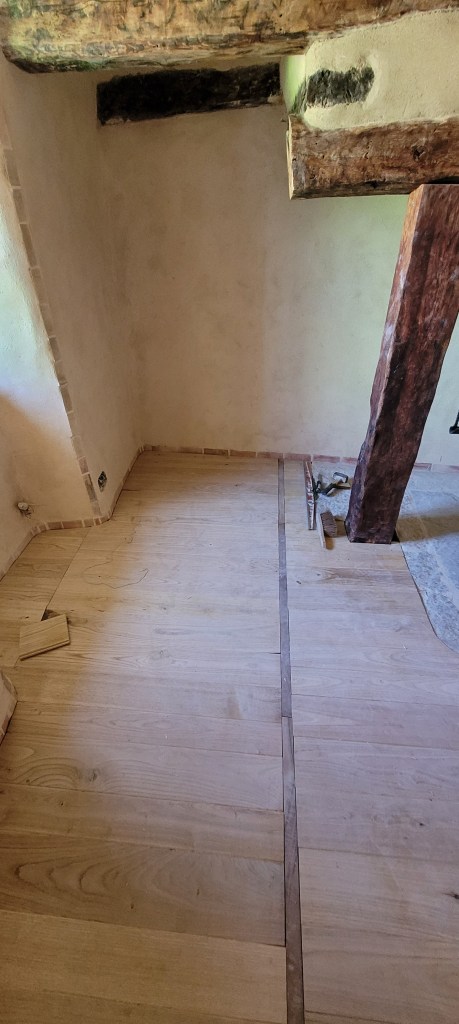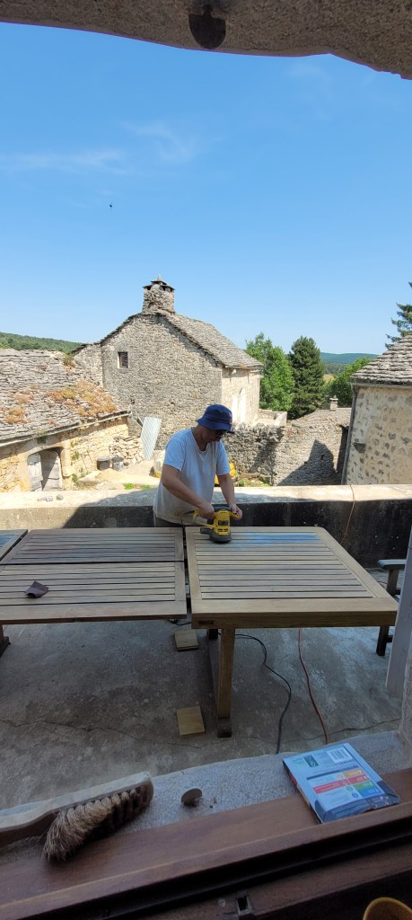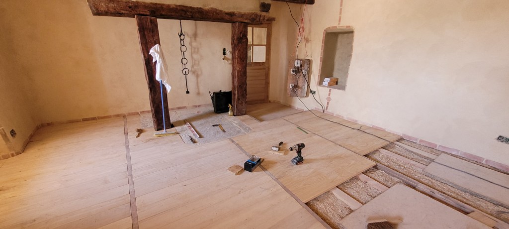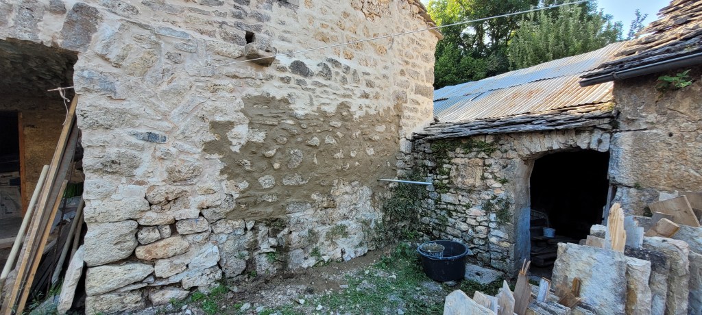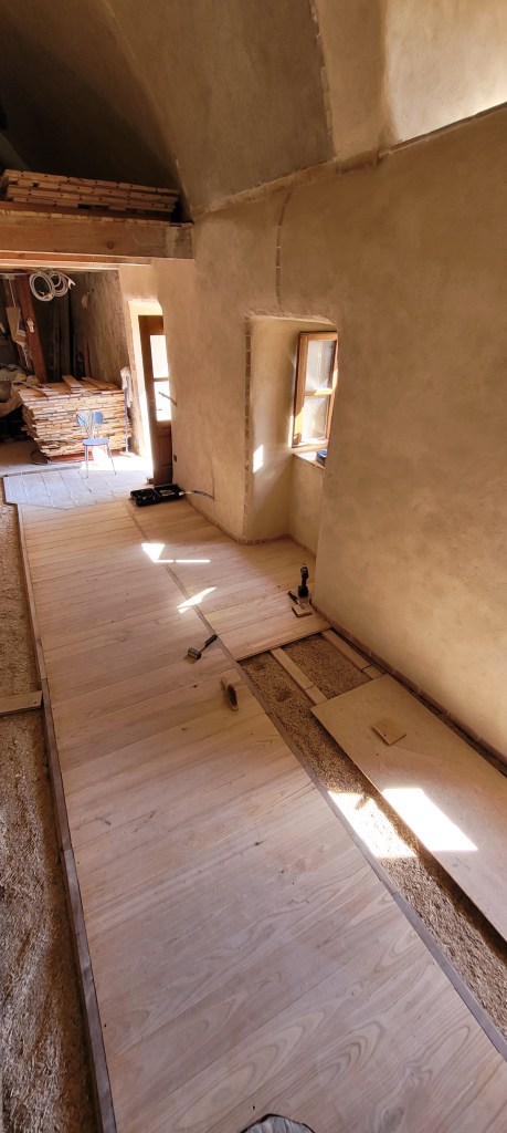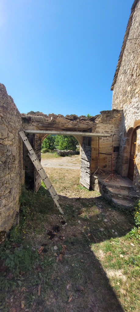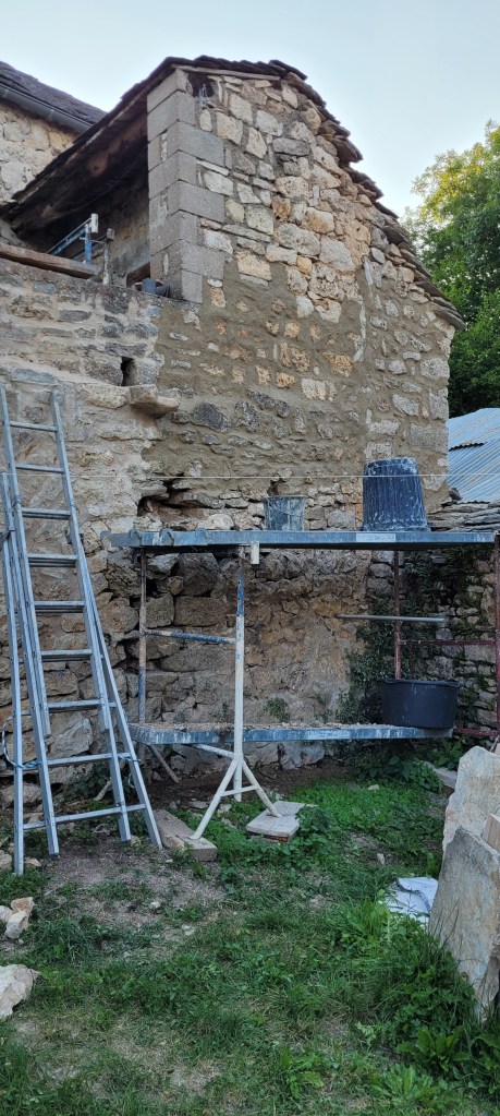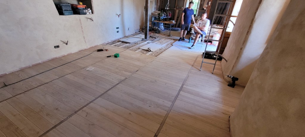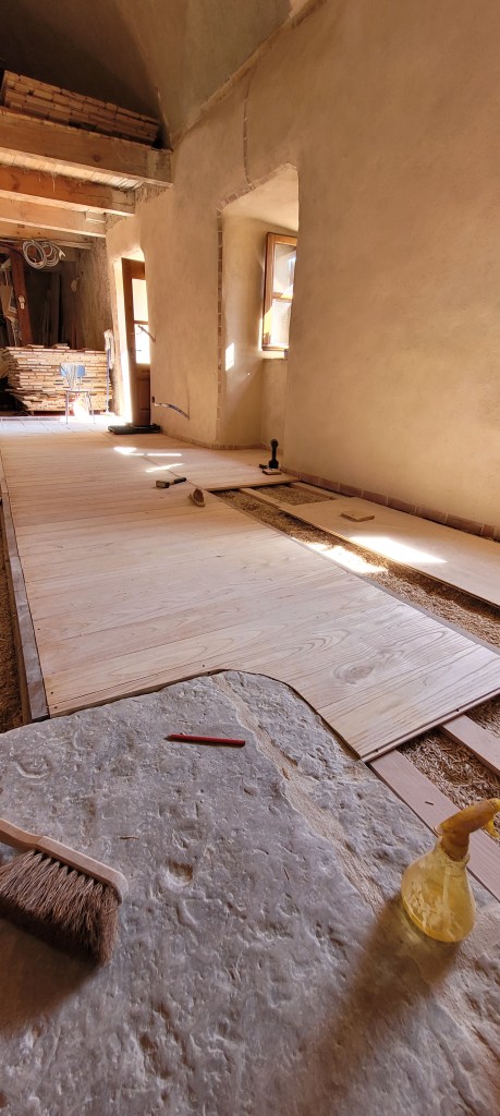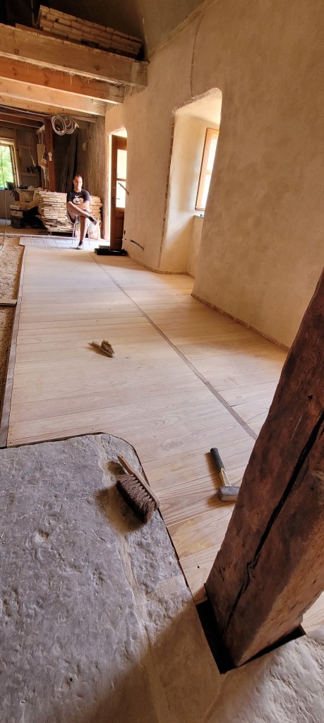 déjà 3 weekends de plus sur le causse depuis la fin des « congés » !!… coup de main de la famille et d’un pote de Leon … du coup , la pose du plancher sera terminée avant l’automne ! ne restera qu’a passer du temps à 4 pattes ,pour le ponçage ,ça ce sera compliqué … en attendant , on presque fini d’enduire le mur de la citerne , et j’ai pris mon courage a 2 mains , le porche est détoituré , c’est parti pour un nouveau porche pour la « vieille » …. le bois est commandé , je compte bien lui refaire une « peau neuve » , le portail, lui , attendra …. pas la baignade !