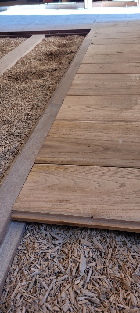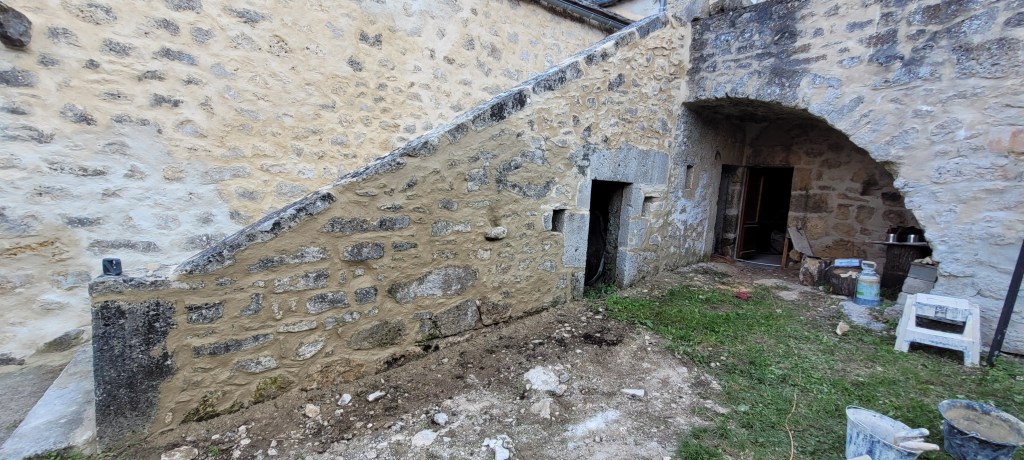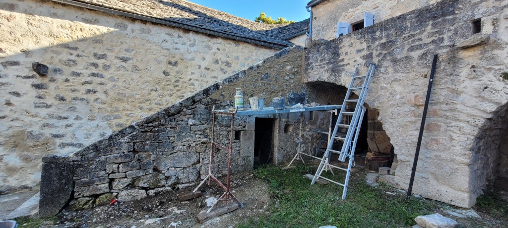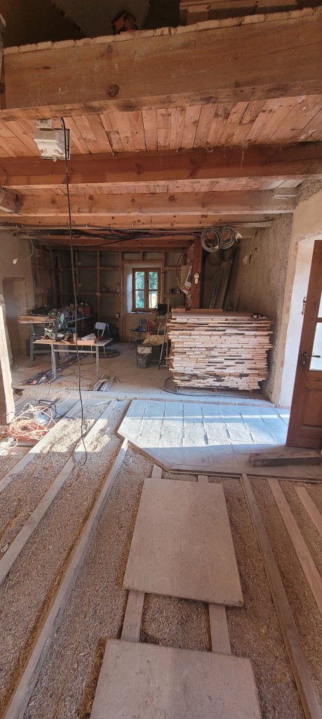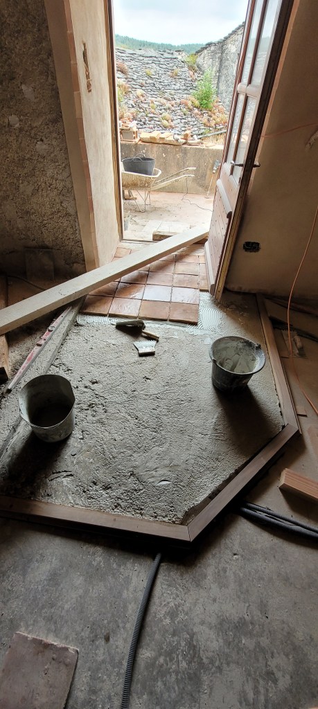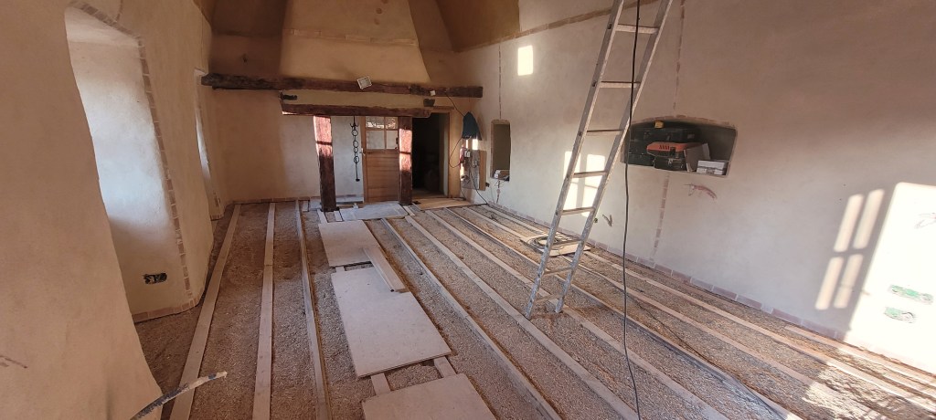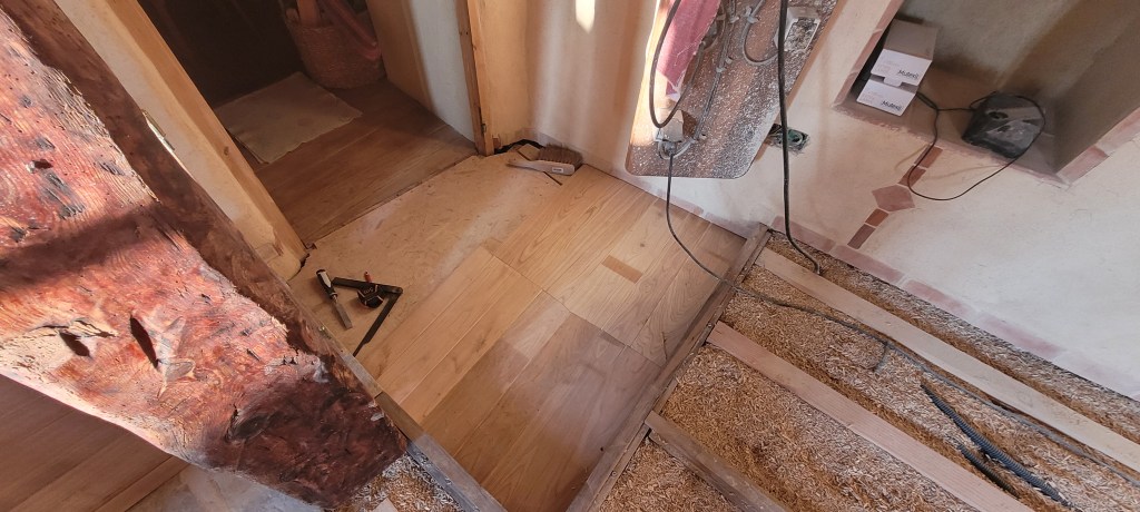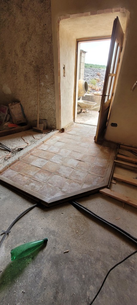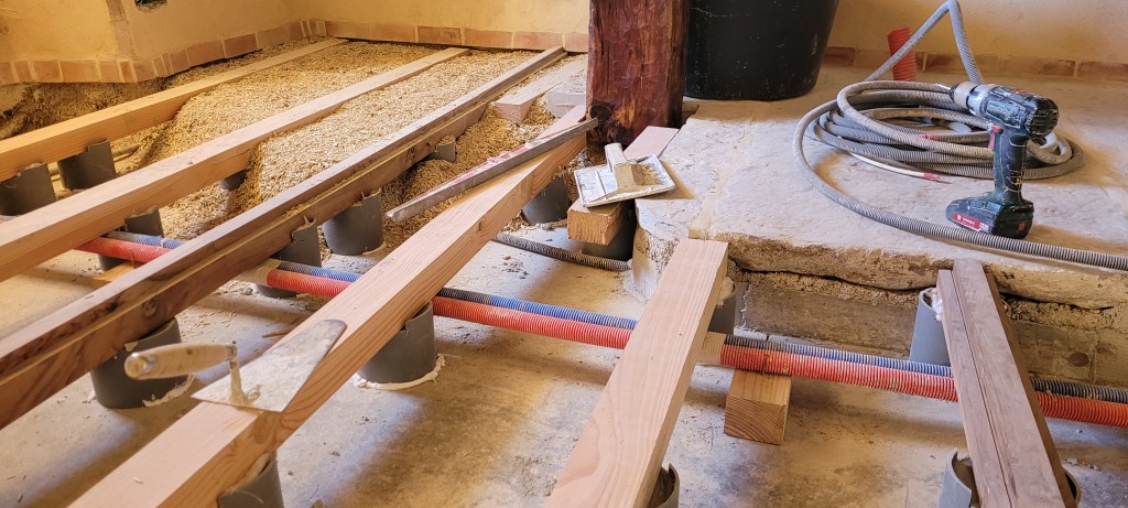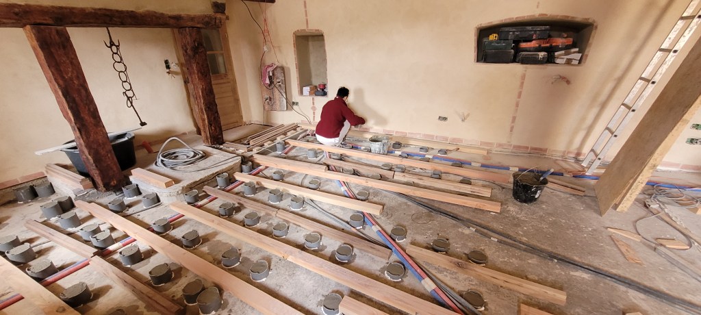 Voila l’été … le temps de bosser dehors est enfin là …plein de chantiers au programme :finir les enduits chez les voisins , couler une dalle d’entrée à carreler avec de vieilles terres cuites dégotées dans une brocante de matériaux , fendre du bois , finir les joints de l’escalier coté cour , et évidemment terminer de lambourder la salle et salon avant réception du plancher , finir de passer les quelques gaines de secours vers la chaufferie avant pose du plancher ,qu’il faudra bien sur rentrer …du coup c’est presque fini !! enfin pas tout à fait …