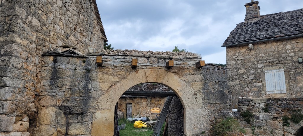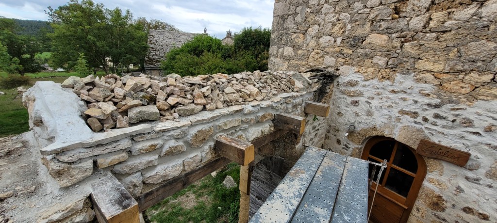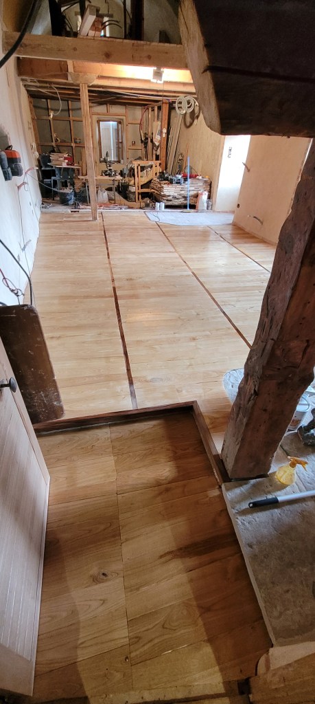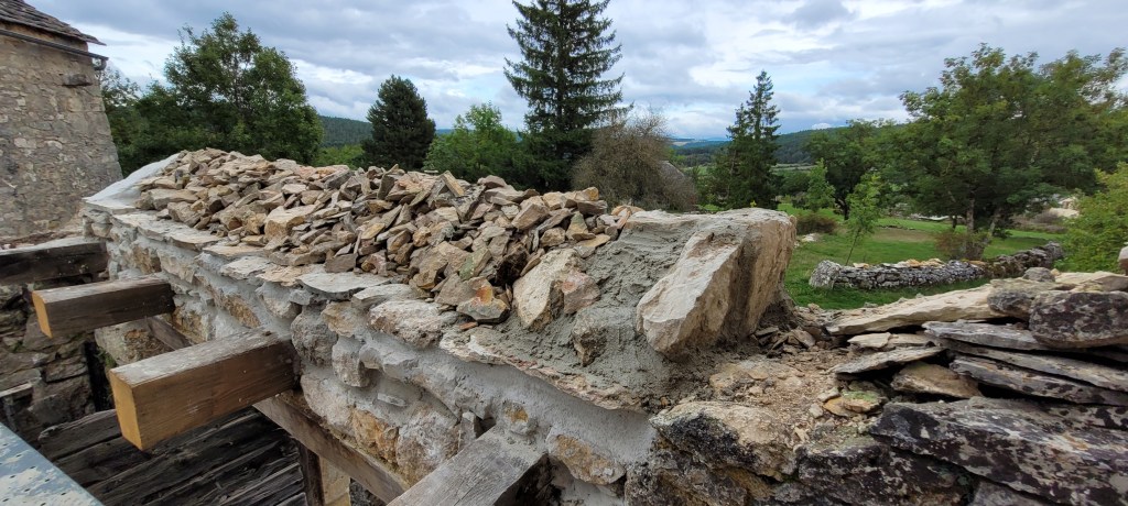 les nuits s’allongent , le temps se gâte , un avant gout d’automne …mais pas encore de cèpes !! cela ne saurait tarder . Steph est monté réparer nos bêtises de l’été, carreaux de la porte du salon pétés cet été pendant la chute de la porte , dégondée pour faire le parquet du palier …. du coup quitte à etre dans le salon , on en a profité pour passer le fond dur sur le parquet, impeccable! la journée du samedi s’est terminée dehors sur l’échafaud pour continuer le porche, bientôt les lauzes !!!