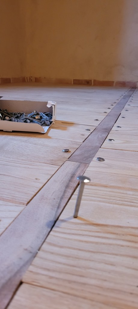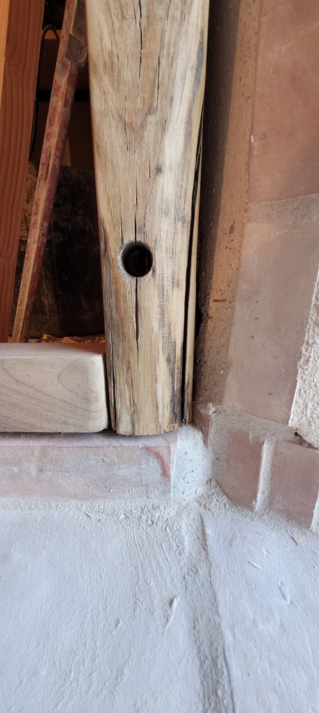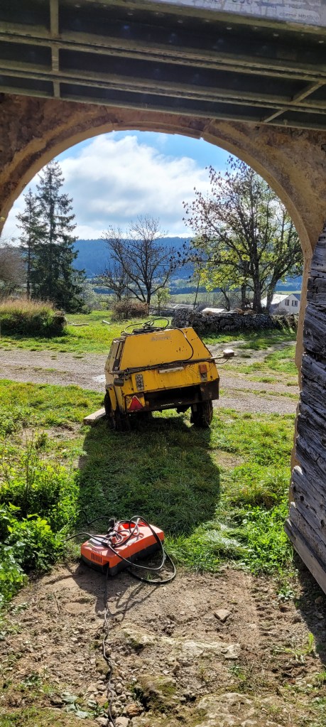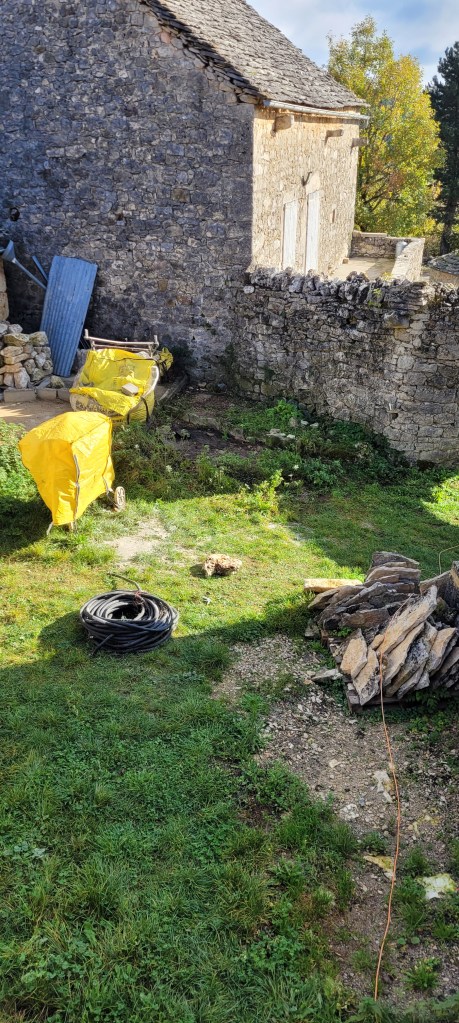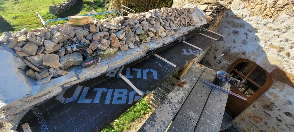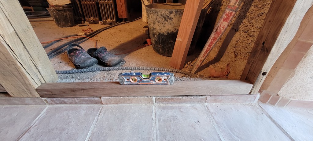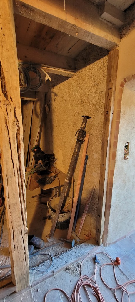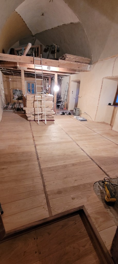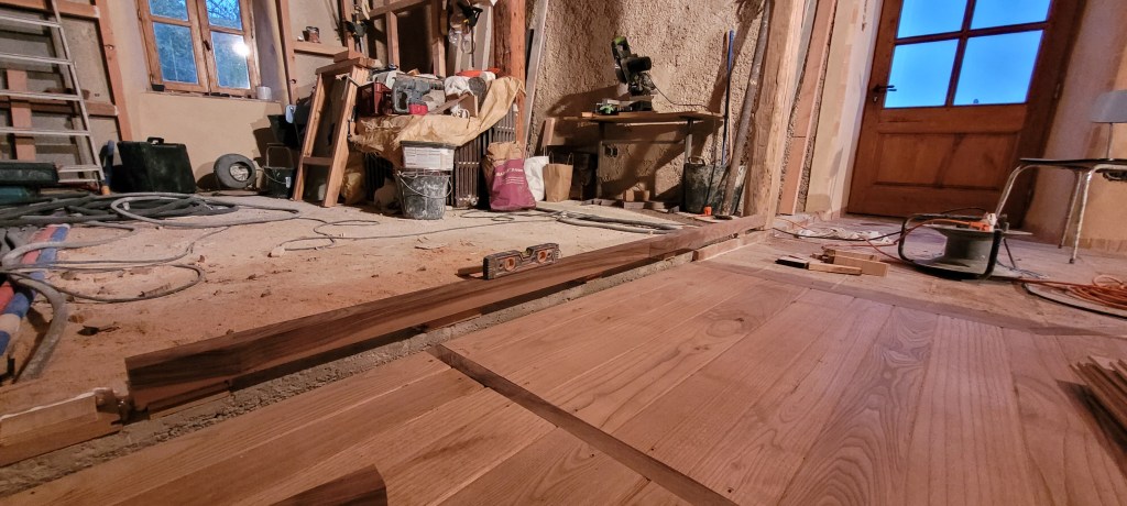 COUCOU les amis , un récap des 3 derniers weekend , ça avance bien (et pas que dans les bois!) la saison du champignon se finie tranquillement , encore qques pieds de mouton et girolles , bon du coup ,je m’y remet vraiment , STEF et LEON sont montés histoire de prendre l’air , et puis 2 weekend à bosser derrière plein de nouveautés ,la plus importante : ça y est , adieu le compresseur ! donné à SAM ;;;il devrait en faire bon usage , une roue à changer et ce sera bon , le salon est isolé par de la laine de bois ,les lambourdes sur une moitié du salon sont posées et fixées ,le seuil lui est parfait : merci STEF du boulot sur ces nez de seuil en noyer ….y a plus qu’a commencé a poser le parquet , à j’oubliais …quelle chienlit les clous à 4 pattes ….mais ça fini bien !! les poteaux en châtaigner de récup qui serviront d’encadrement du placard de l’entrée sont posés, vitrifiés et enfin les voliges du porche en vieux châtaigner sont posées et protégées par un pare pluie …pour passer l’hiver avant pose des lauzes ;