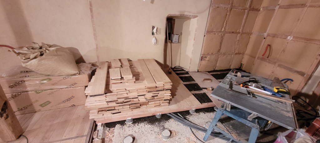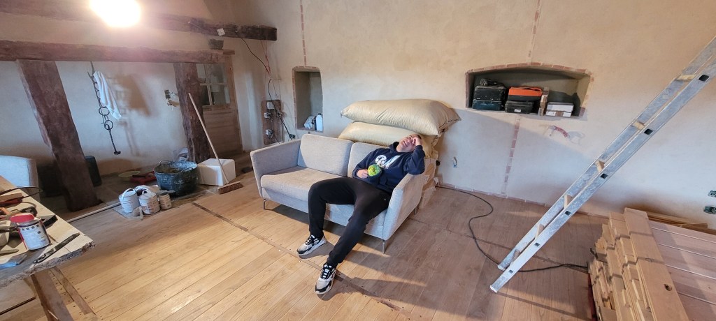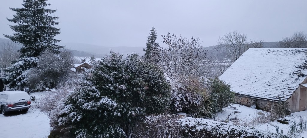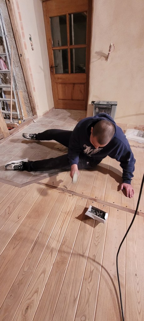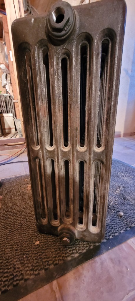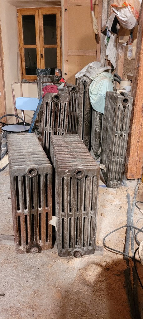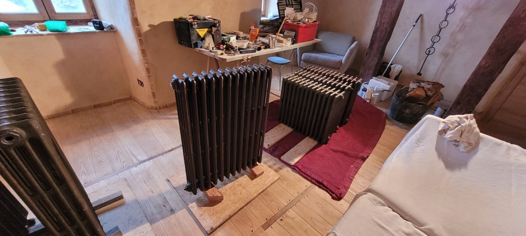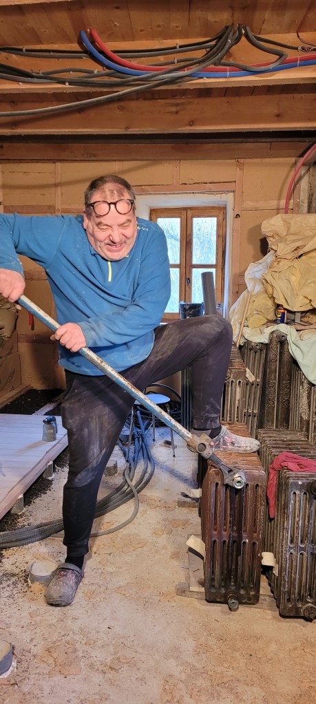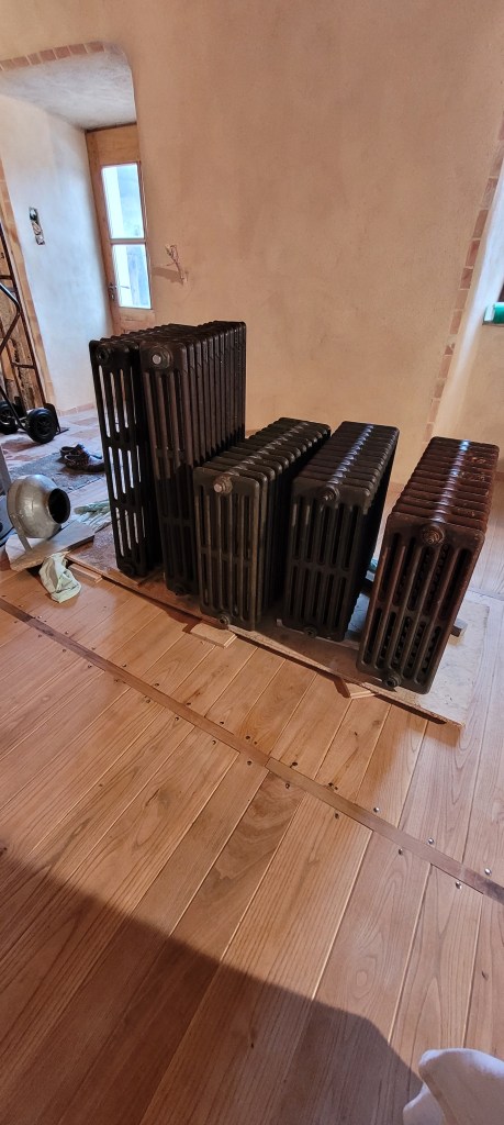 on y est …. un aller retour express sur Florac un samedi matin de novembre à la fraiche -7° … ne manque plus que la neige , ah ben trop tard ,les flocons sont là ..aussi vite dit , qu’ils arrivent ! vite je rentre à la chaleur du chantier (7 à 10° et sans chauffage) , bien joué l’isolation sous plancher et chaux chanvre sur les murs ,ainsi que la laine de bois dans le salon , le parquet est commencé dans le salon , environ la moitié de fait . Pause obligatoire pour le plancher , il est enfin temps de s’occuper des ces vieux radiateurs en fonte récupérés il y a plus de 10 ans ,de les soigner ,bichonner, rustoler … le plus léger environ 60 kg pour le plus lourd ,je dirais pas loin de 200 kg …..ça devrait bien chauffer « la vieille » ,une fois raccordés à une future chaudière ,on y est pas encore …reste un peu de chemin ,mais ça c’est une autre histoire !