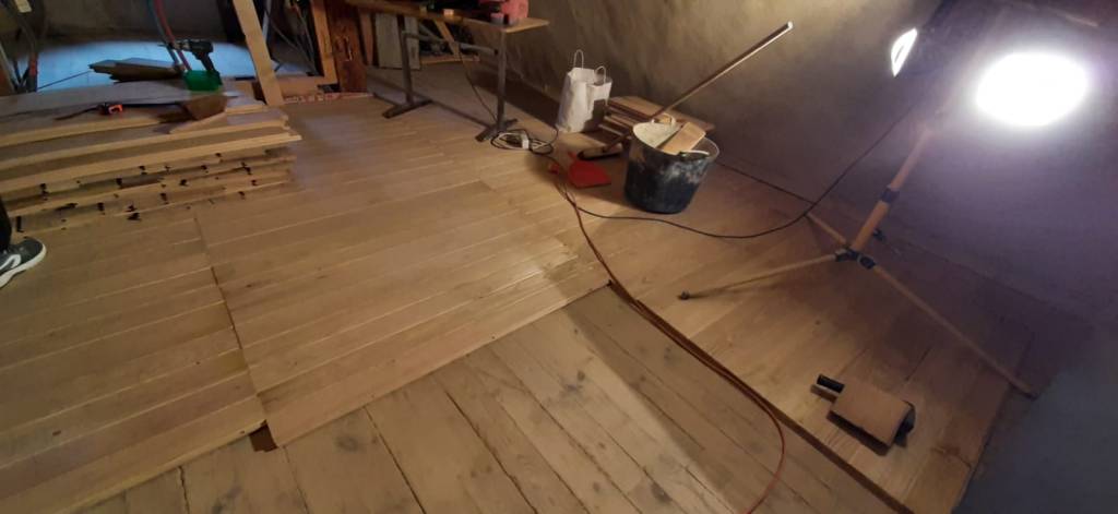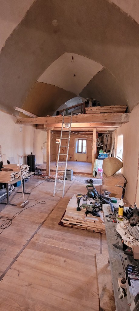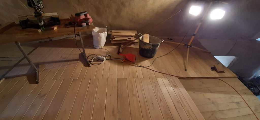 Le plancher du salon est TERMINEEEEEEE , marre d’etre au ras du sol ! du coup je monte d’un cran direction la mezzanine ,et là : devinez ? à 4 pattes … c’est reparti pour le plancher sous la voute , il ne reste que quelques m2 , et ce sera fini (pour le plancher) …il me reste à poser le bac de douche , le popo et le lavabo ,et la piaule d’amis sera quasi bouclée …. et commencera la belle histoire de l’ESCALIER …