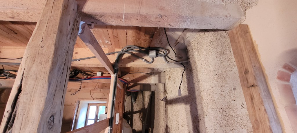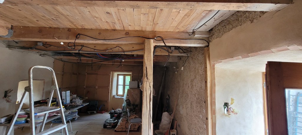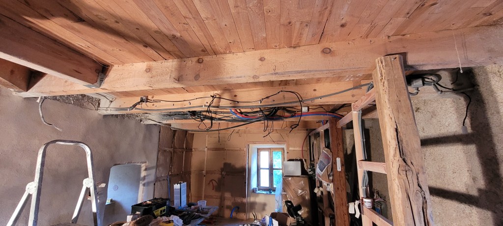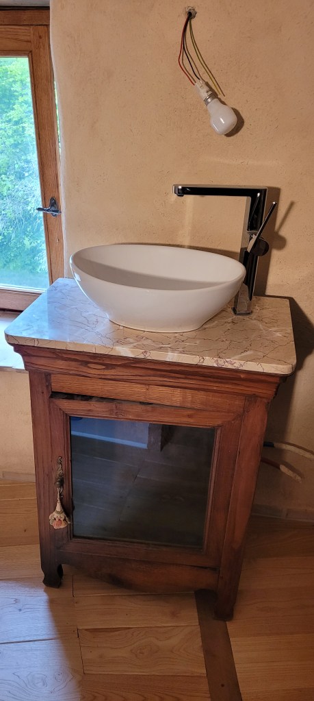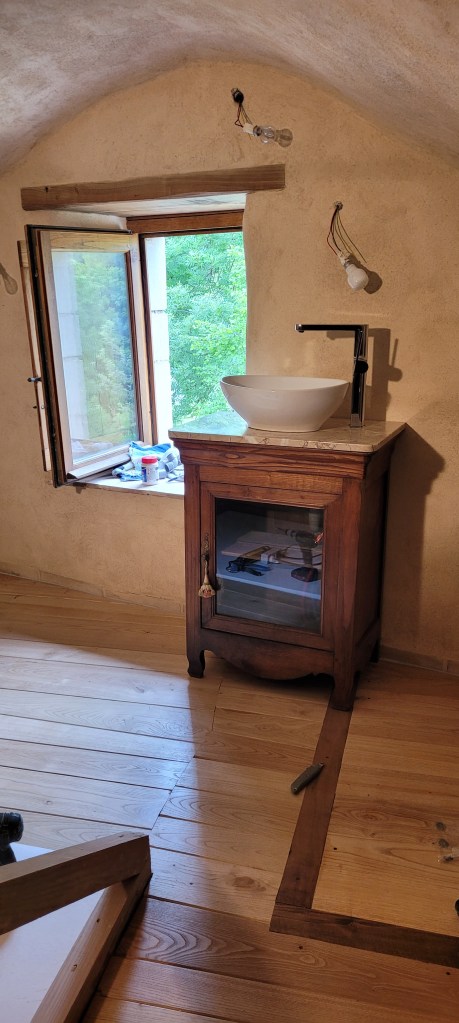 de retour sur le causse , bien tardif ….arrivé sur les coups de 1 h du matin ,malgré la nuit ,les senteurs de foin coupé, de fleurs …explosent dans l’air ,une bien belle saison qui démarre … en attendant je profite pour continuer les finitions bien entamées , mais ce sera long : comme d’hab ! c’est le plus long ; l’électricité du salon ainsi que sur la mezzanine est terminée (en attendant les inter et appareillage tableau à effectuer !) le lavabo est raccordé (sans fuites! bien joué ) allez FEU ;;;