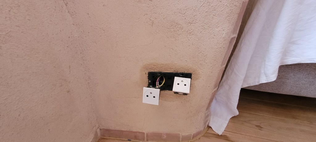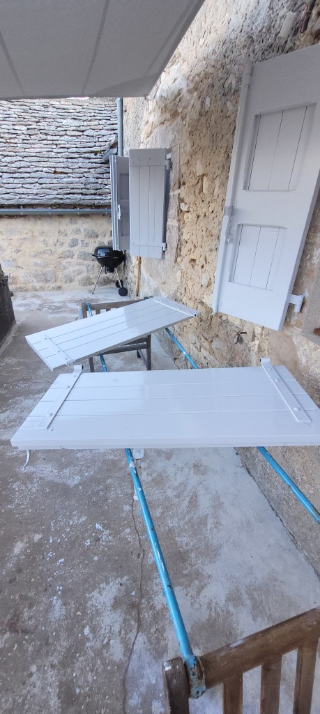 il et temps de combler l’espace du blog depuis tous ces weekends passés avant les vacances : diverses finitions sont réalisées , enduit autour des prises et mise en place des équipements élec (interrupteurs et prises and c° ) … on profite de la canicule pour une nouvelle fois repeindre les volets (6 paires tout de même ) en espérant être tranquille pour qques années ! allez go ..