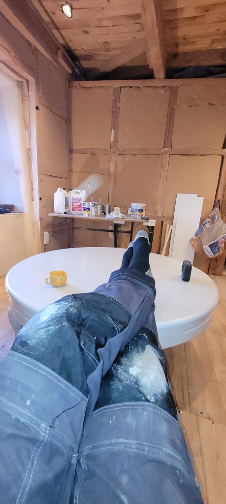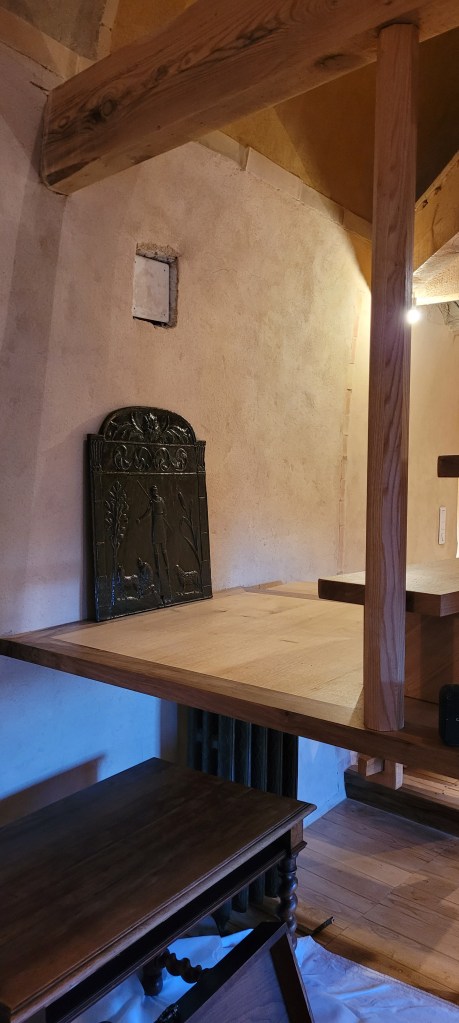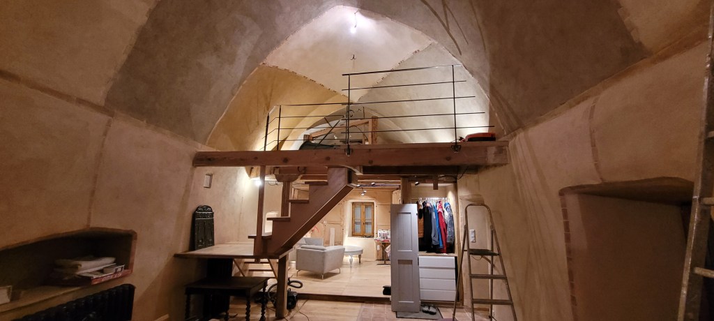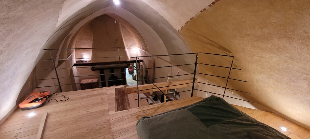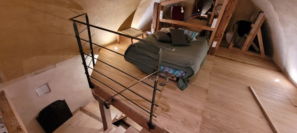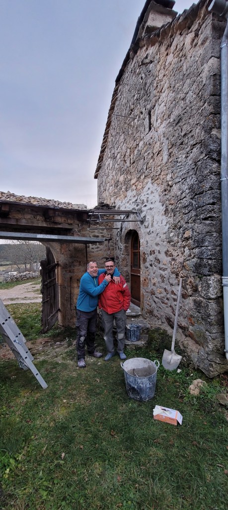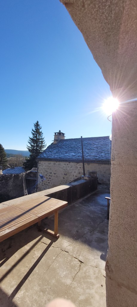 Cette fin d’année s’avance à grands pas , il est prévu de passer un 1 er noël la haut sur le Causse … « la vieille » est désormais accueillante , bien chaude , avec de la superficie , ces 4 années d’effort auront permis d’agrandir de 90 m2 d’un coup ! elle commence à ressembler à ce que je pouvais imaginer il y a 13 ans . Mais , ne nous emballons pas …il en reste beaucoup à faire , mais ce dernier weekend avec Stef (une fois de plus ) aura été prolifique , la paire de volets sur le balcon pour protéger la porte d’entrée est posée , ne restera à finaliser que la crémone qui est a restaurer (récup de Marseille), le ferronnier à bien travailler , les gardes au corps ainsi que la main courante sont posés pour accéder en sécurité sur la mezzanine . et pour finir en beauté le « squelette métallique » de la marquise de l’atelier est scellé …